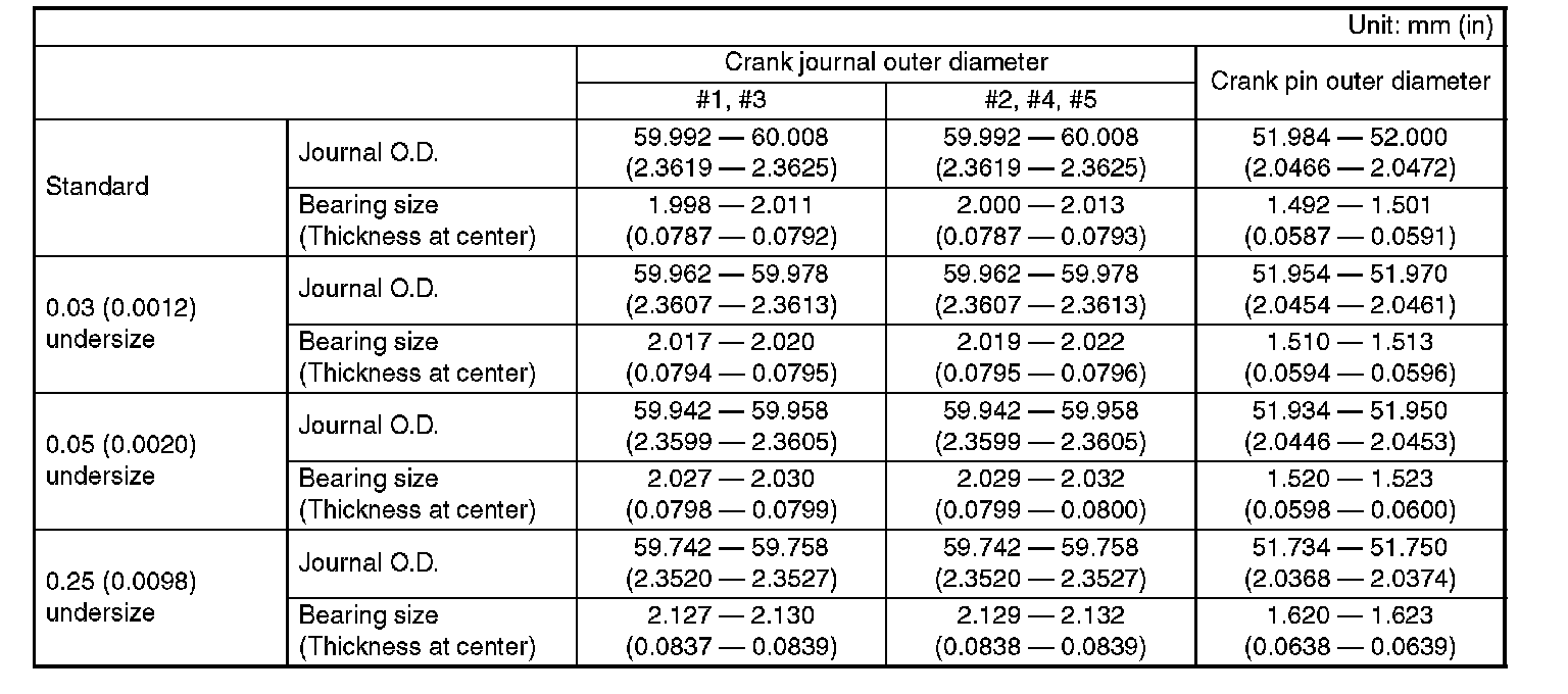 3) Inspect the crank journal and crank pin for wear. If they are not within the specifications, replace the bearing with a suitable (undersize) one, and replace or recondition crankshaft as necessary. When grinding the crank journal or crank pin, finish them to the specified dimensions according to the undersize bearing to be used.