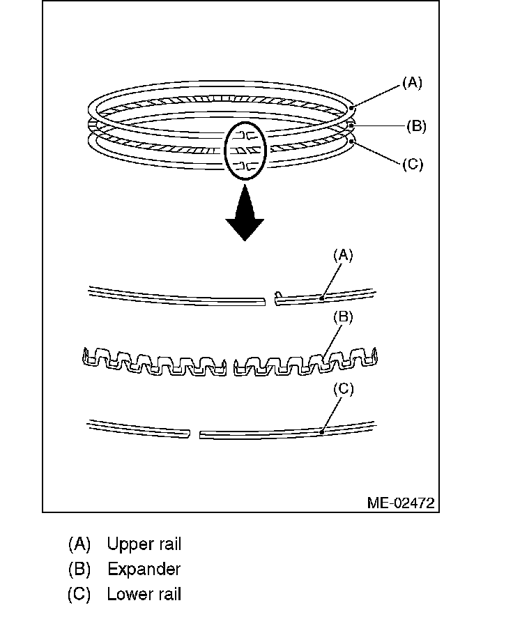 ^ Oil ring consists of the upper rail, expander and lower rail. Be careful about the direction of rail when installing the oil ring to piston.