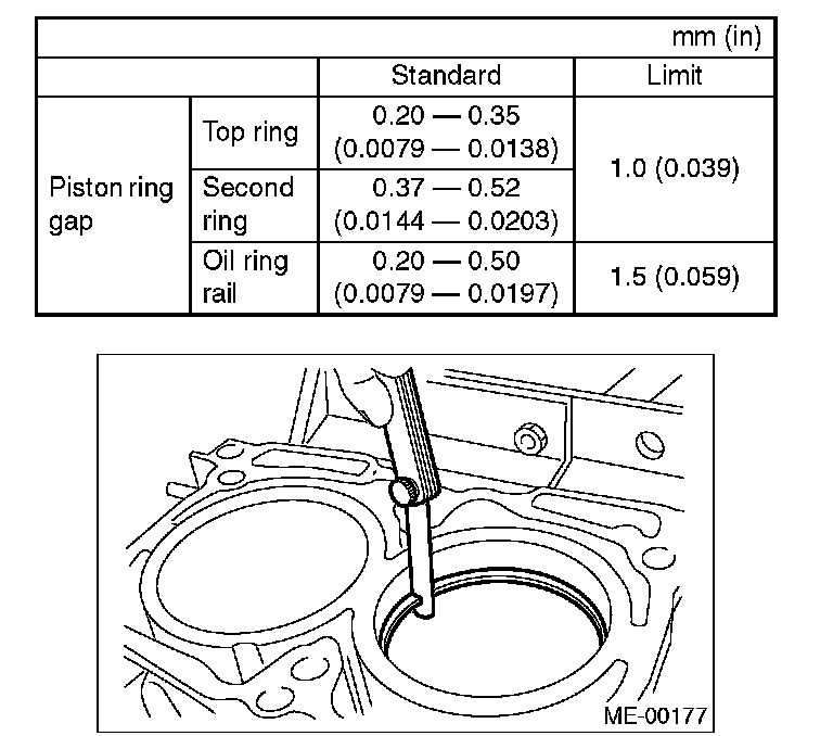 3) Squarely place the piston ring and oil ring in cylinder, and measure the piston ring gap with a thickness gauge.