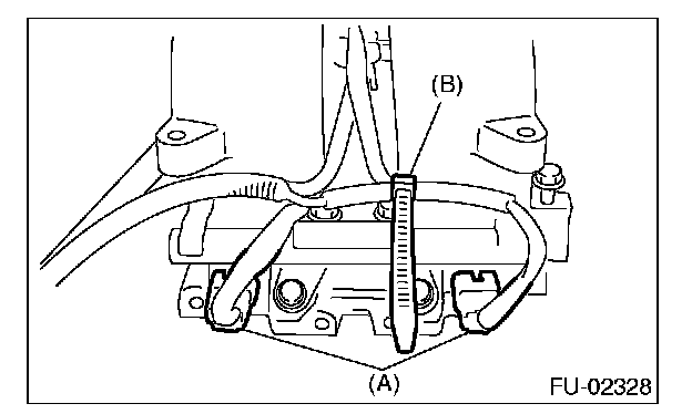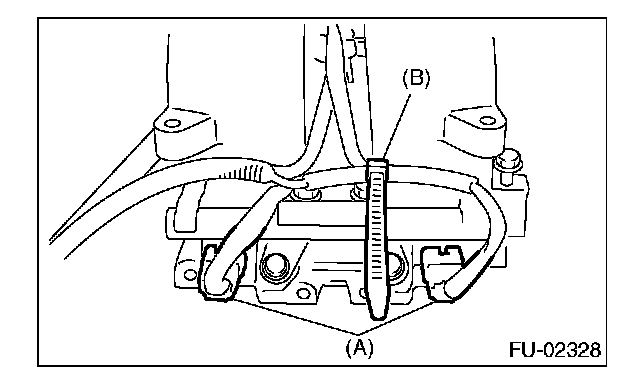 10. Remove the harness band (B) which holds engine harness to injector pipe.