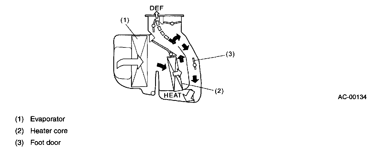 - The air that has passed through the evaporator is heated at the heater core and flows through the foot door to the foot duct.