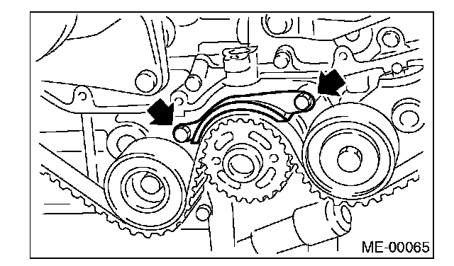 (2) Using white paint, put alignment marks or arrow marks on the timing belts in relation to the crank sprocket and cam sprockets.
