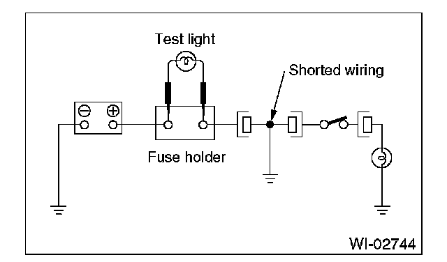Connect a test lamp (rated at approx. 3 watts) in place of the blown fuse and allow current to flow through the circuit. Disconnect one connector at a time from the circuit, starting with the one located farthest from power supply. If the test lamp goes out when a connector is disconnected, the wiring between that connection and next connector (farther from the power supply) is shorted.
