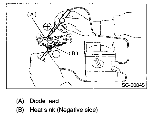 Check for continuity between the diode lead and positive side heat sink. The positive diode is in good condition if resistance is 1 Ohm or less only in the direction from the diode lead to heat sink.