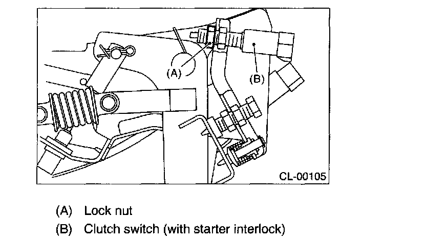 2. Confirm that the engine starts when the clutch pedal is fully depressed. If the engine does not start, adjust the clutch switch and inspect the starter interlock circuit.