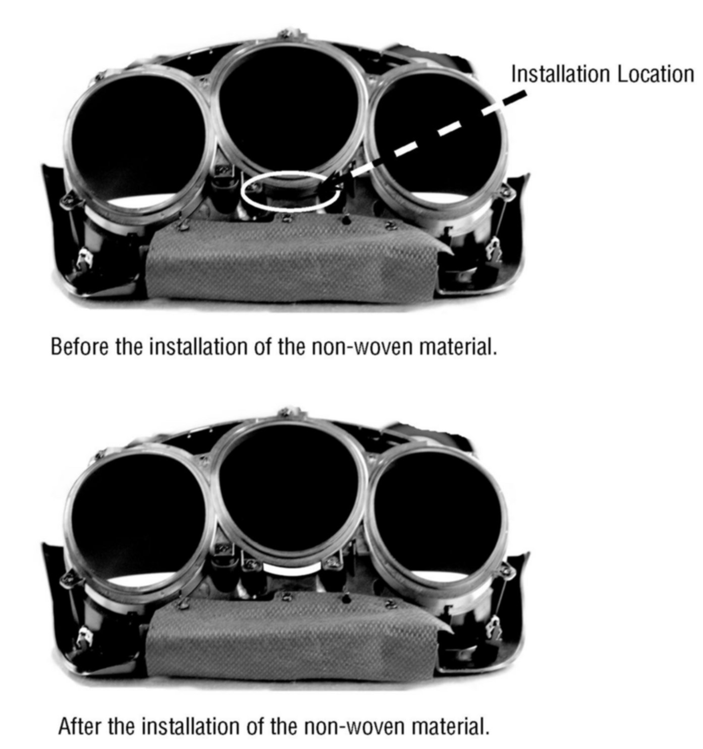 5) Install a piece of non-woven material (10 mm wide x 20 mm long) to the combination meter bezel where indicated. Install a second piece with the same dimensions directly on top of the first piece to insure proper insulation.