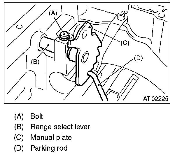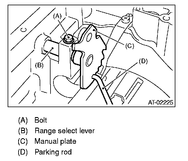12. Remove bolts securing range select lever, then remove range select lever, manual plate and parking rod.