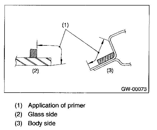7. Apply primer to the adhesive layer of body. Primer once attached to the painted surface of the body and internal trim is hard to wipe off. Mask the circumference of such areas. Let the primer dry for about ten minutes before installing the glass.