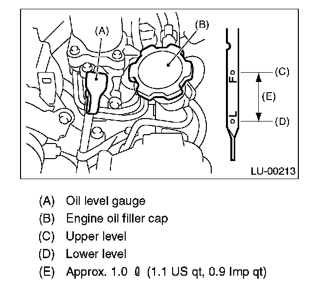 4. Remove it again and check the engine oil level. If the engine oil level is below "L" line, add oil to bring the level up to "F" line.