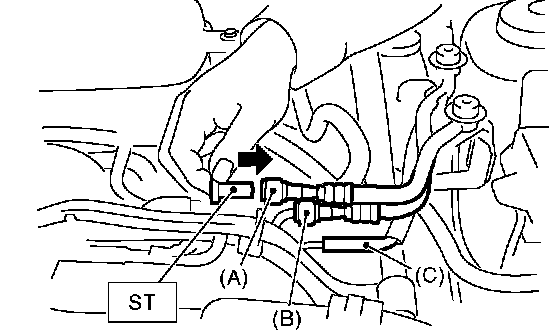 a Disconnect the connectors of fuel delivery and return lines by pushing the ST to the direction of arrow.