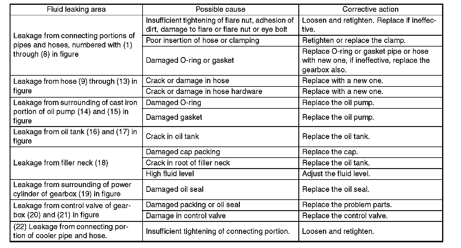 NOTE: It is likely that although one judges fluid leakage, there is actually no leakage. This is because the fluid spilt during the last maintenance was not completely wiped off. Be sure to wipe off spilt fluid thoroughly after maintenance.