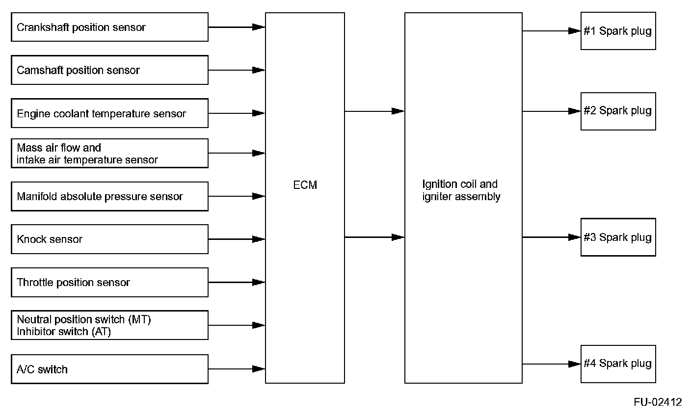 IGNITION CONTROL- The ECM determines operating condition of the engine based on signals from the manifold absolute pressure sensor, engine coolant temperature sensor, intake air temperature sensor, crankshaft position sensor and other sources. The ECM then selects the ignition timing most appropriate for the condition thus determined from those stored in its memory and outputs at that timing a primary current OFF signal to the igniter to initiate ignition.