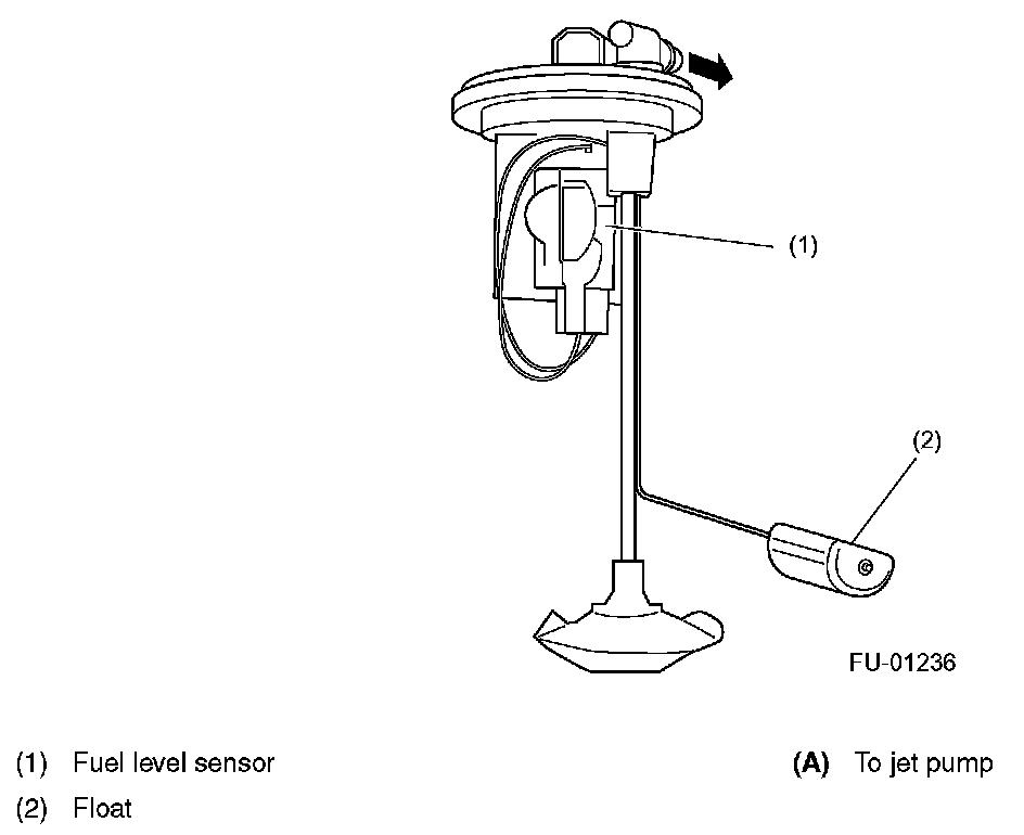 SUB-COMPARTMENT FUEL LEVEL SENSORThis sensor detects the level of the fuel in the sub side (the side without a fuel pump) of the fuel tank. Also, when the jet pump is operating, fuel in the sub side is drawn up and transferred to the fuel pump.