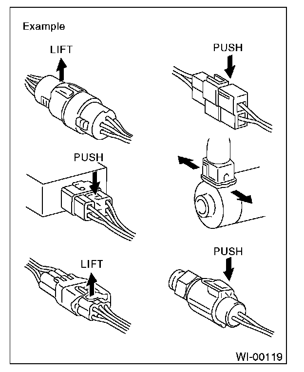 5. Some connectors are provided with a lock. One type of such a connector is disconnected by pushing the lock, and the other, by moving the lock up. In either type the lock shape must be identified before attempting to disconnect the connector.