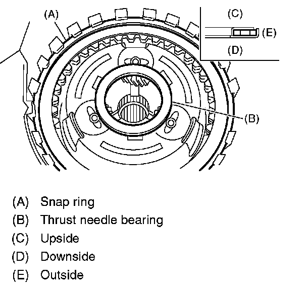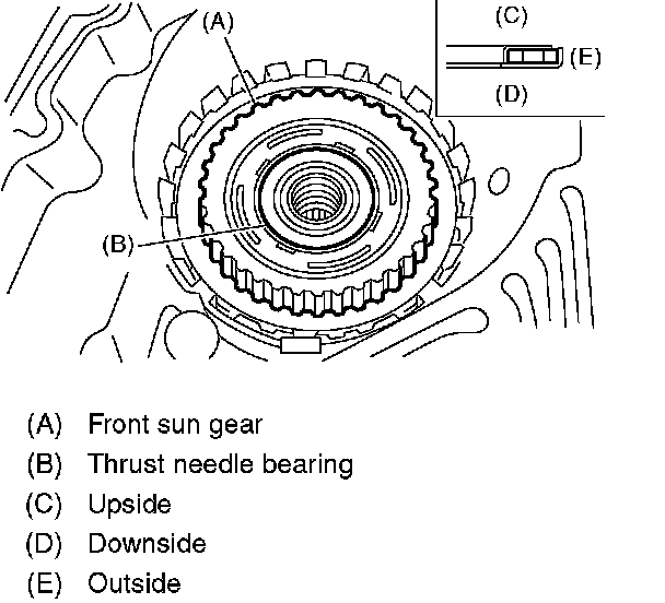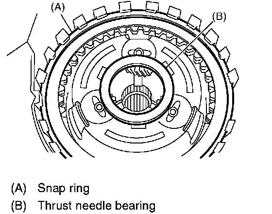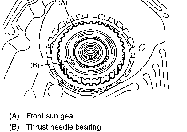 Attach the thrust needle bearing to hub using Vaseline, and then install the hub by correctly engaging the splines of the front planetary carrier.