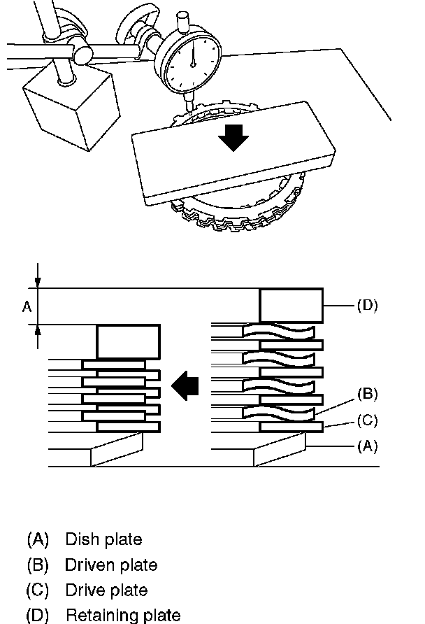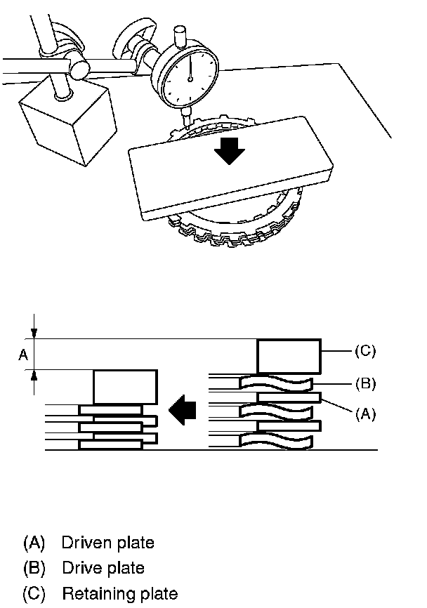 Select the retaining plate within the specification by calculating with A and B dimensions which have been recorded before. If the calculated value exceeds the service limit, replace the drive plate with a new one and adjust it within the specification.