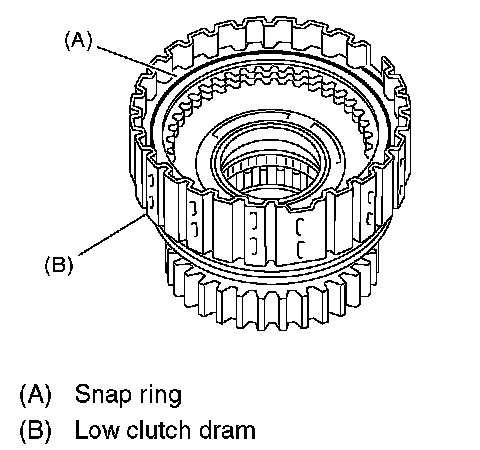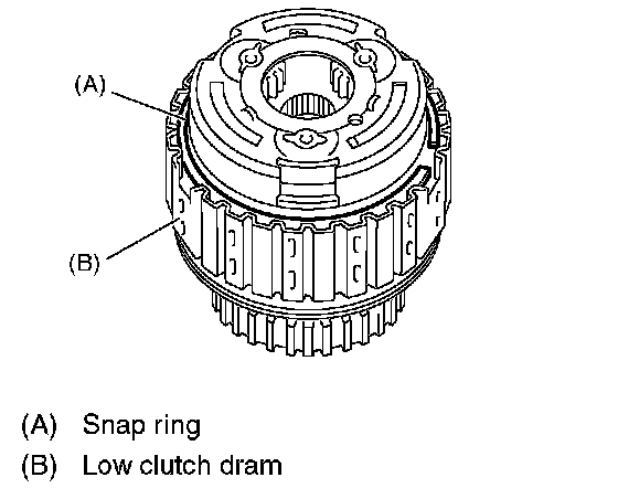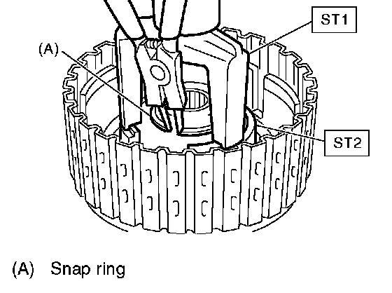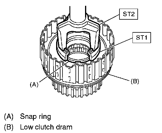 7. Compress the spring retainer, and remove the snap ring from low clutch drum using ST1 and ST2.