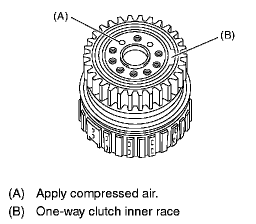 9. Install the one-way clutch inner race to low clutch drum, and then apply compressed air to remove the low clutch piston.