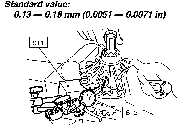 9. Turn the drive pinion several times with ST1 and check to see if the backlash is within the specified value with ST2, ST3, ST4 and ST5.