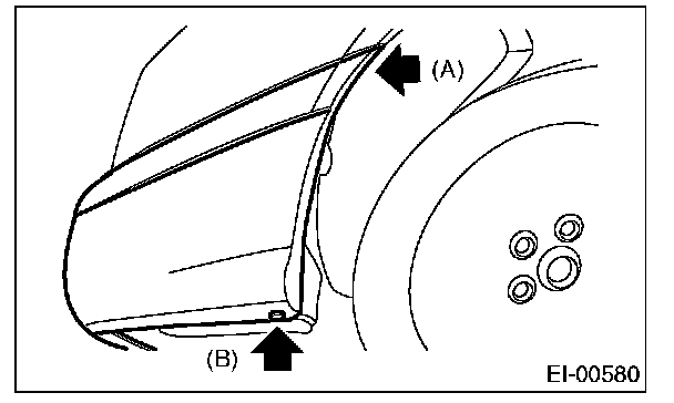 4. Turn over the mud guard, and remove the bolt (A) inside wheel house, and the clips (B) on the lower side of bumper.