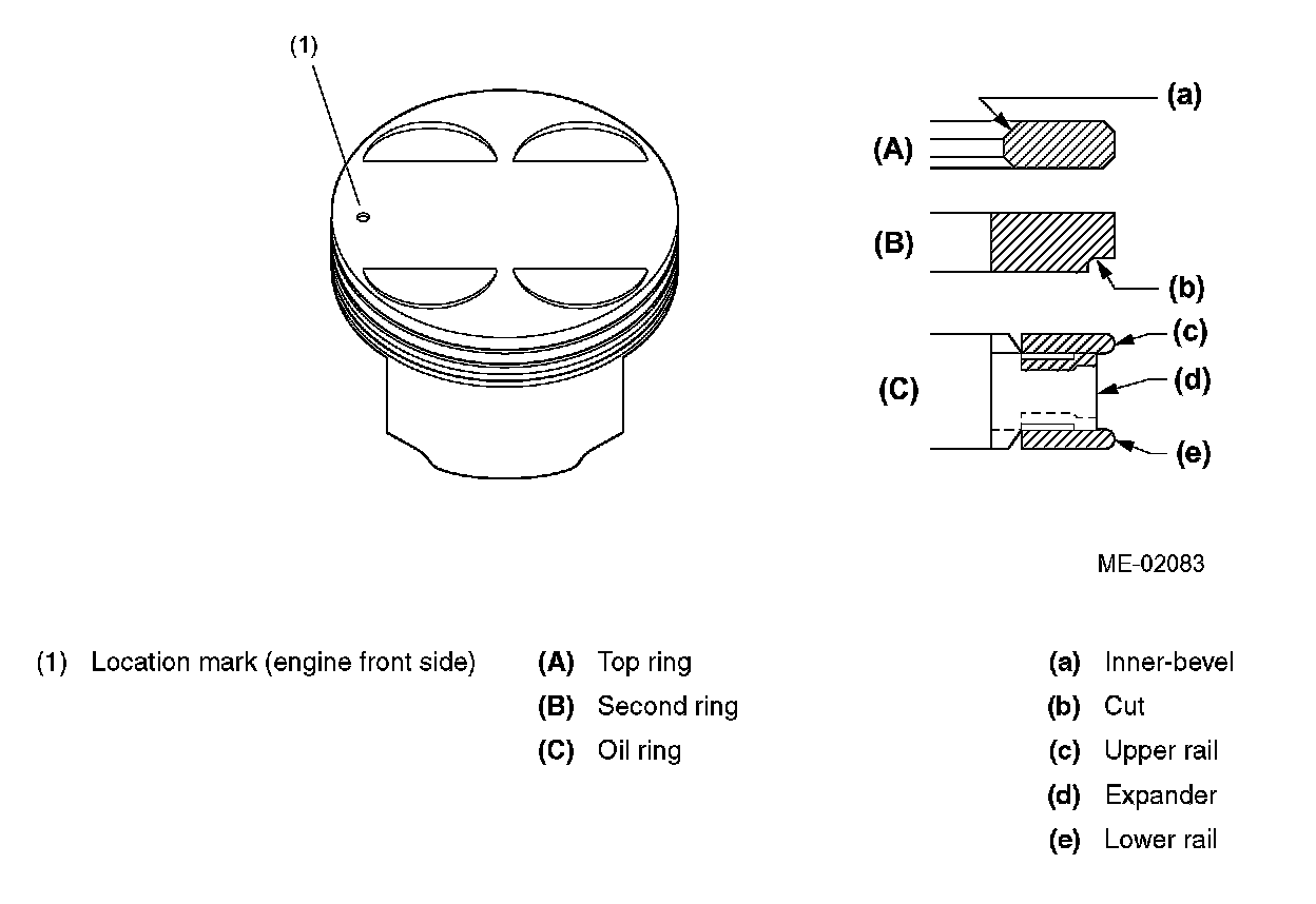 All the right and left bank pistons are the same in shape. Each piston has a location mark (mark indicating the front of engine) on its top.