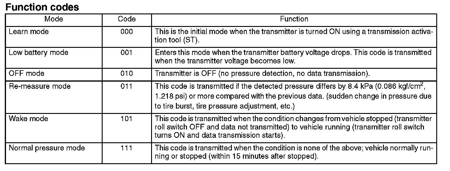 When the vehicle speed increases to 11 - 32 km/h (7 - 20 MPH), the roll switch built in the sensor turns ON, and the sensor starts to transmit pressure data*1 together with the ID code*2 and function code*3.