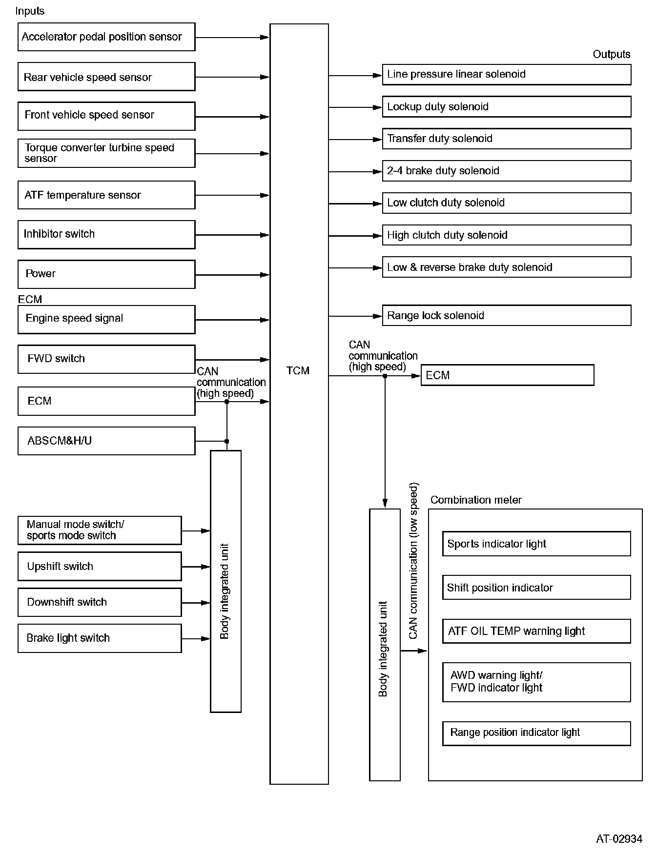 The electro-hydraulic control system for the transmission and transfer consists of various sensors and switches, a transmission control module (TCM) and the control valves including solenoid valves. The system controls the automatic transmission operation, including gear shifting, lockup clutch operation, line pressure, pattern selection (NORMAL and SPORTS), and gear-shift timing. It also controls the operation of the transfer clutch. The TCM determines the vehicle's operating conditions from various input signals and controls a total of seven solenoids (line pressure linear solenoid, lockup duty solenoid, 2-4 brake duty solenoid, low clutch duty solenoid, high clutch duty solenoid, low & reverse duty solenoid, and transfer duty solenoid) by sending appropriate signals to them.