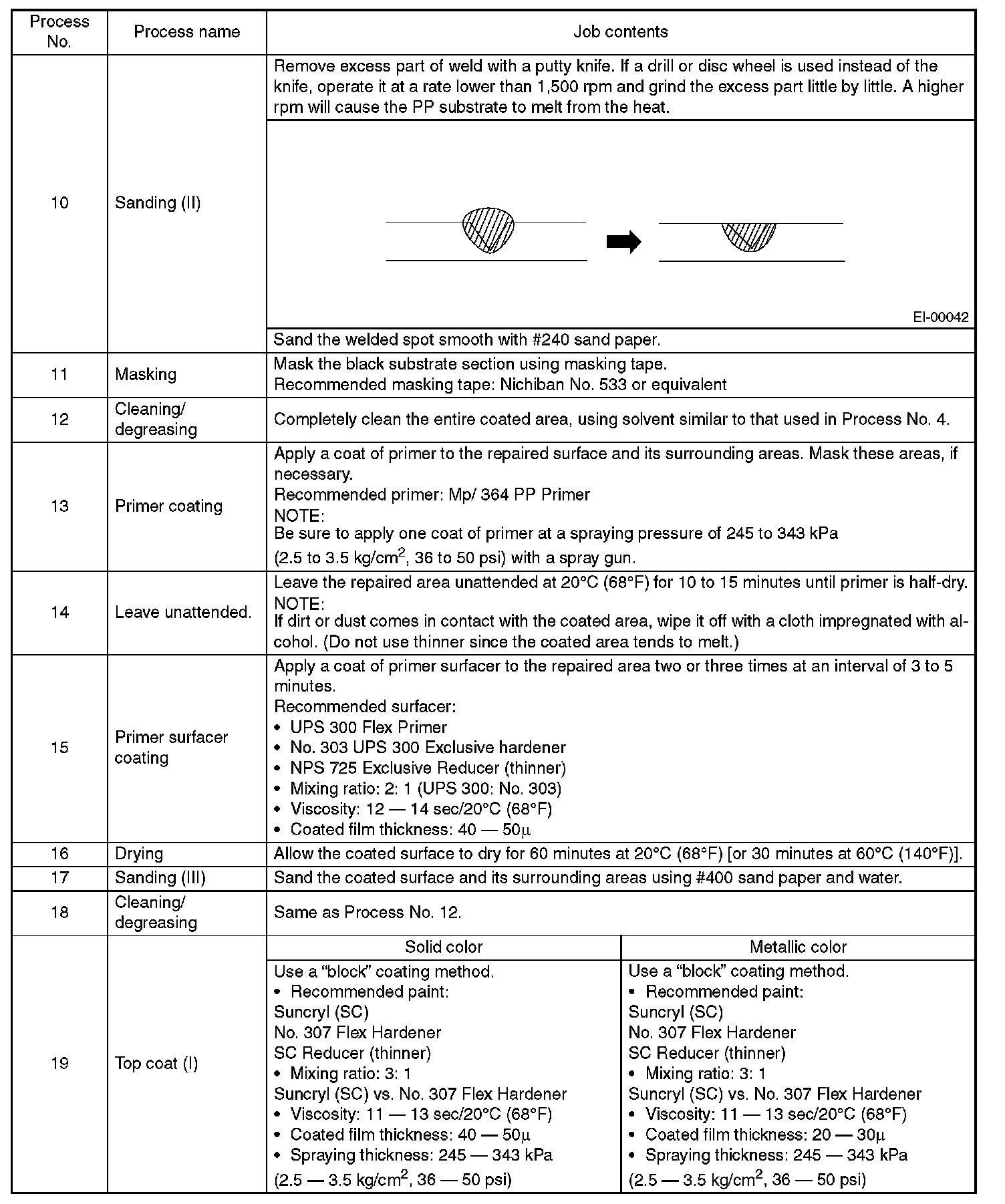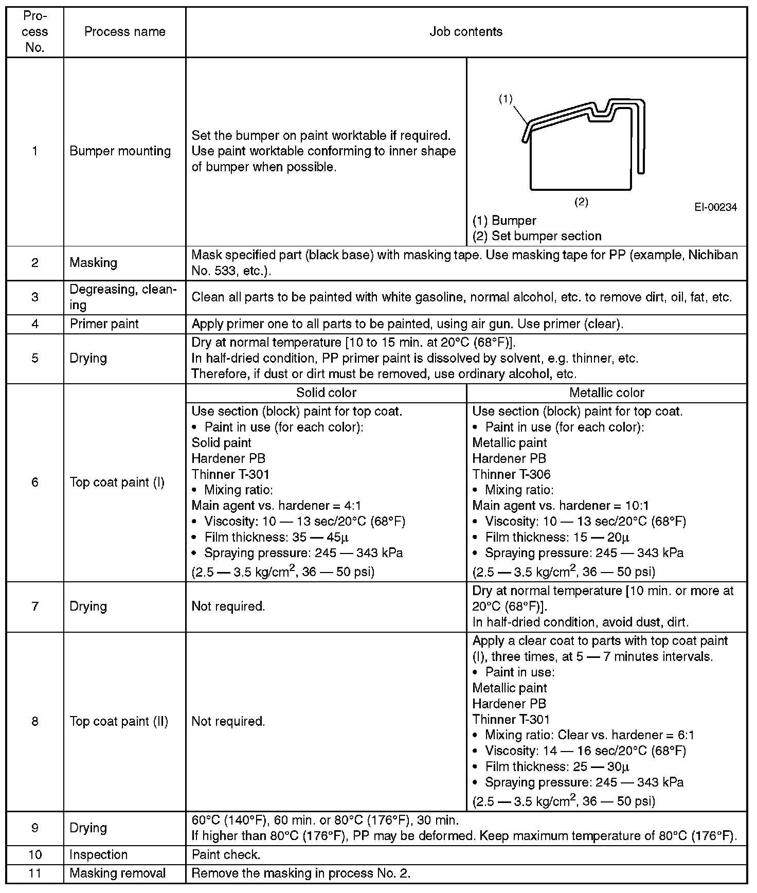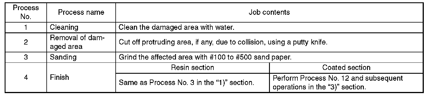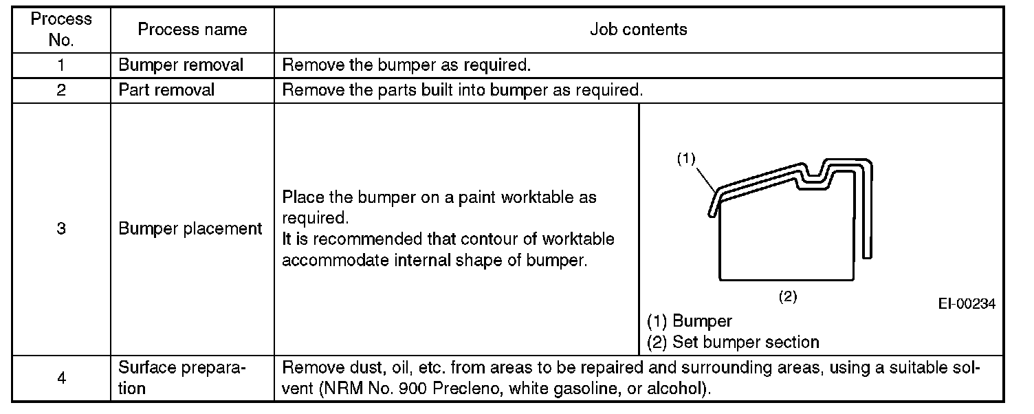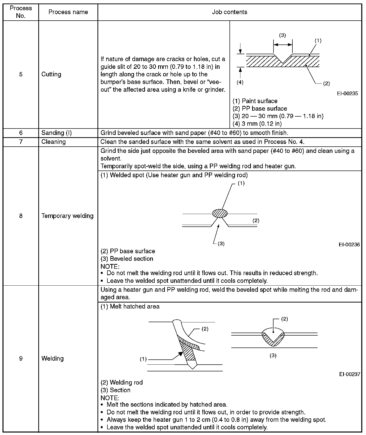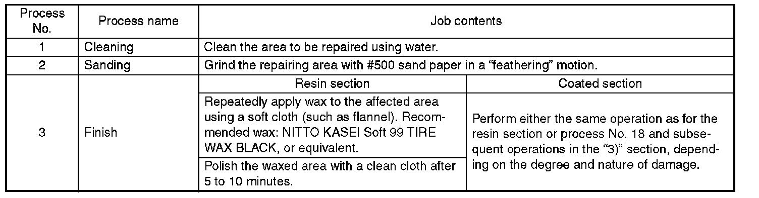 NOTE: All PP bumpers are provided with a grained surface, and if the surface is damaged, it cannot normally be restored to its former condition. Damage limited to shallow scratches that cause only a change in the lustre of the base material or coating, can be almost fully restored. Before repairing a damaged area, explain this point to the customer and get an understanding about the matter. Repair methods are outlined below, based on a classification of the extent of damage.
