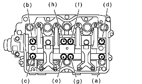 NOTE: Leave two or three threads of bolts (g) and (h) engaged in order to retain the valve rocker assembly.