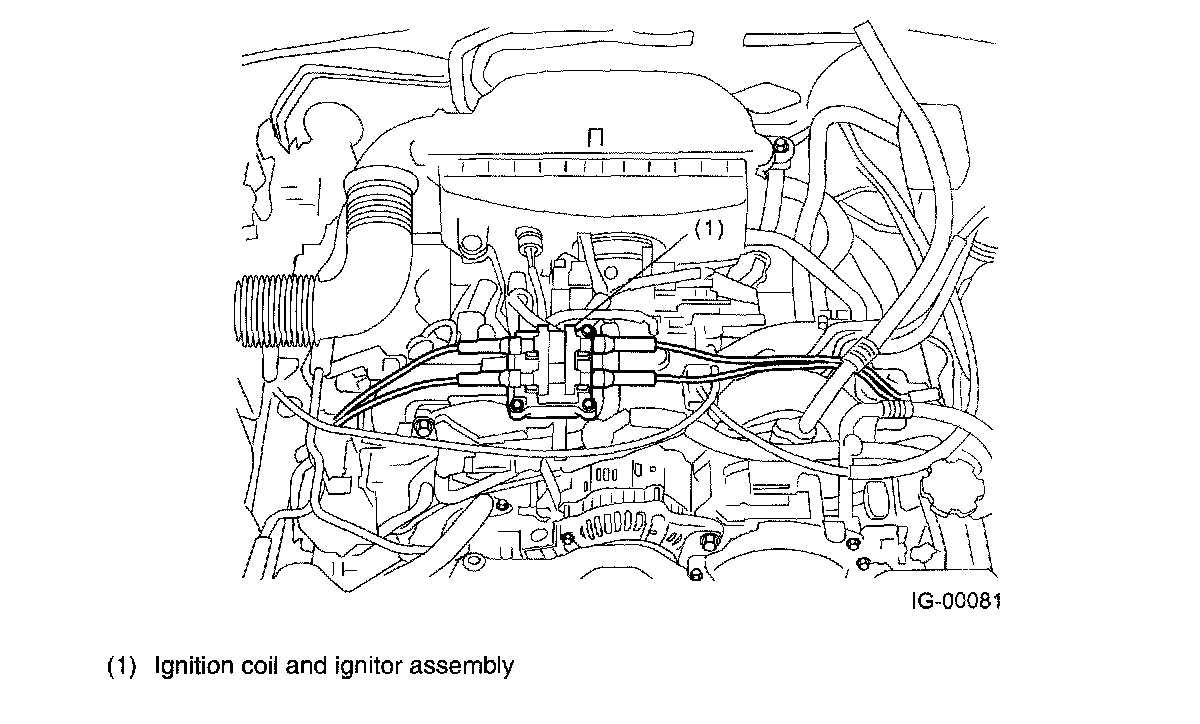 Ignition coils are made integral with an ignitor. The ignition system is of a dual-ignition-coil design, each coil causing two plugs to generate sparks simultaneously. In response to the signal from the ECM, the ignitor supplies current to an ignition coil and the ignition coil supplies high-voltage current to a pair of spark plugs (#1 and #2 or #3 and #4) simultaneously.