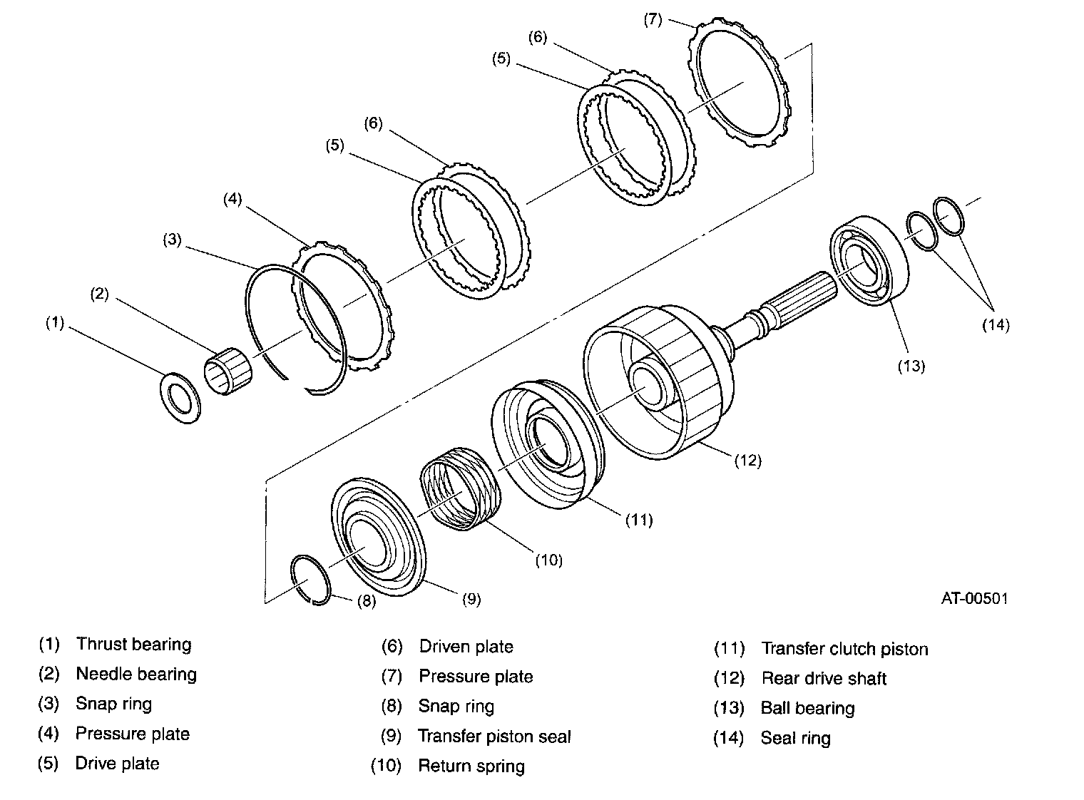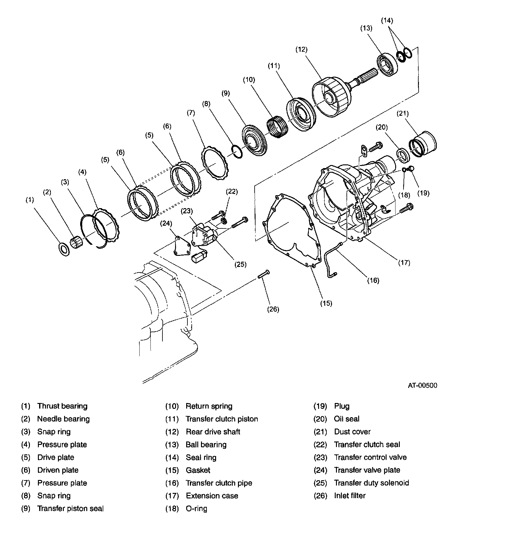 This All-Wheel-Drive (AWD) transfer system uses an electronically controlled multi-plate type transfer clutch. The clutch is controlled by the TCM through the transfer hydraulic pressure control unit which consists of a duty-cycle-controlled solenoid valve and is located at the rear of the automatic transmission section together with the vehicle speed sensor.