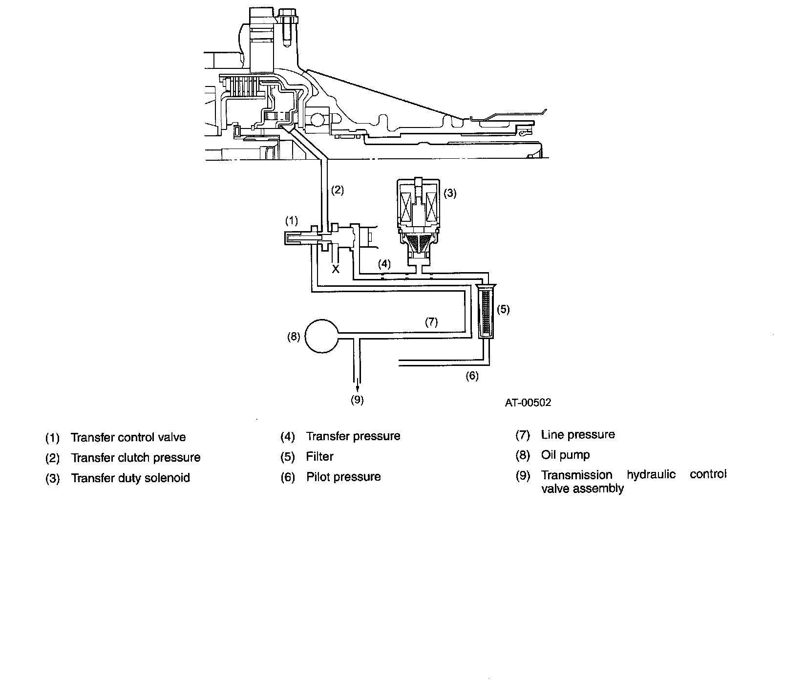 The transfer duty solenoid adjusts the pilot pressure of the transfer clutch valve depending on the signals from the TCM. The transfer clutch valve in turn modulates the line pressure into the transfer clutch pressure before it is applied to the clutch piston.
