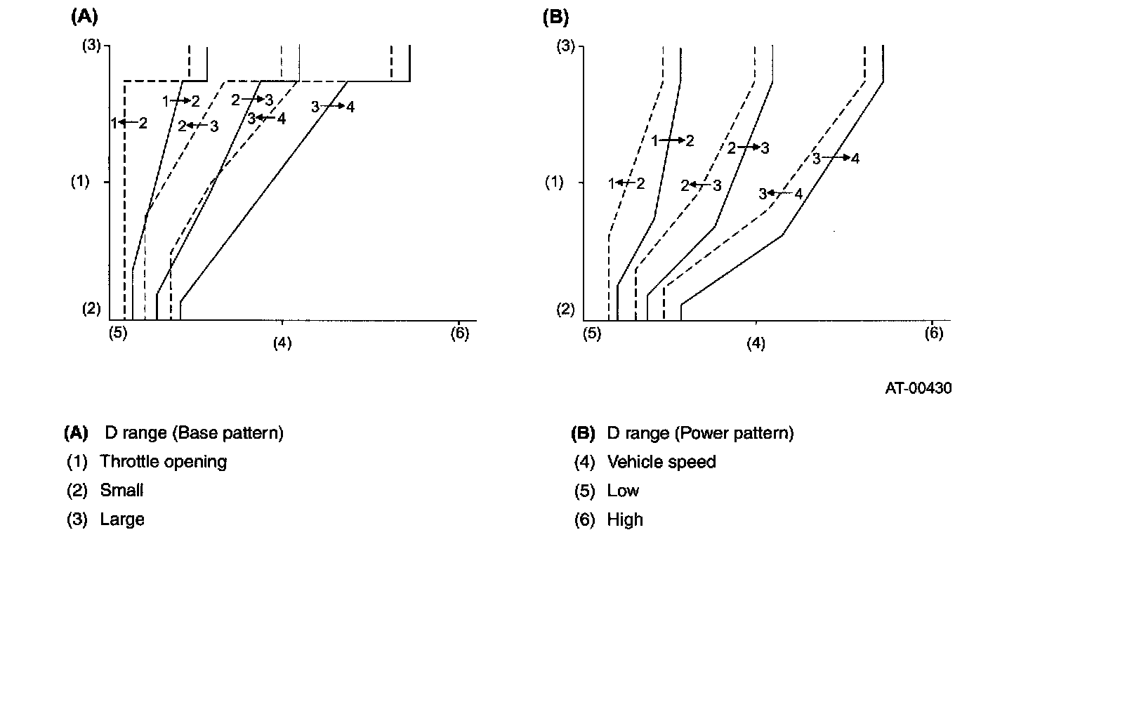 In the Power pattern, the downshift point and upshift point are set higher than those of the Base pattern.