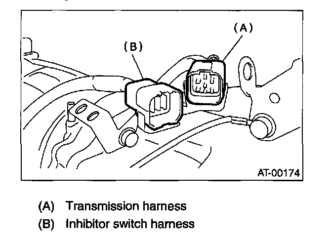 5) Lift-up lever behind the transmission harness connector and disconnect it from stay.