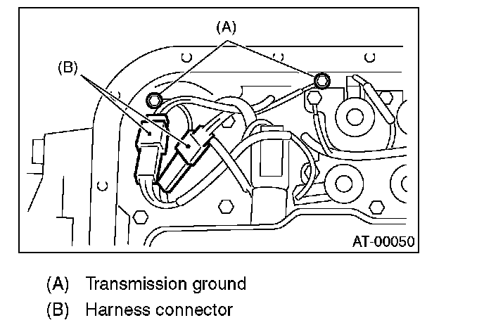 24. Disconnect the harness connector and transmission ground terminal. (Non-turbo model)