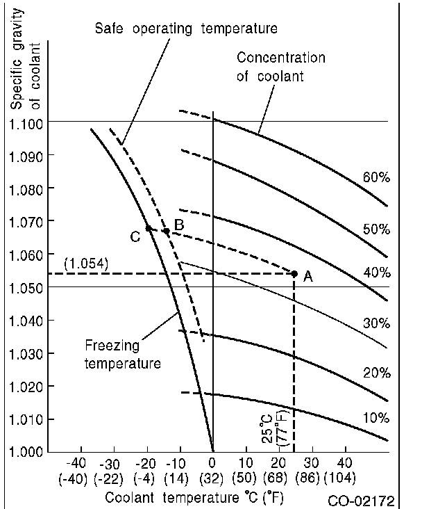 If the coolant temperature is 25°C (77°F) and its specific gravity is 1.054, the concentration is 35% (point A), the safe operating temperature is -14°C (7°F) (point B), and the freezing temperature is -20°C (-4°F) (point C).
