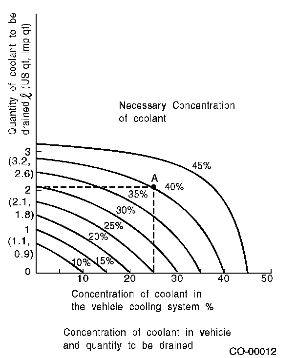 Assume that the engine coolant concentration must be increased from 25% to 40%. Find point A, where the 25% line of engine coolant concentration intersects with the 40% curve of the necessary engine coolant concentration, and read the scale on the vertical axis of the graph at height A. The quantity of coolant to be drained is 2.12;(2.2 US qt, 1.8 Imp qt). Drain 2.1 2(2.2 US qt, 1.8 Imp qt) of coolant from the cooling system and add 2.1 2(2.2 US qt, 1.8 Imp qt) of the undiluted solution of SUBARU coolant.