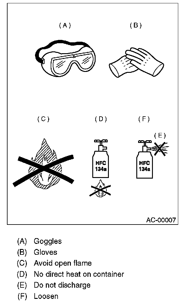 When handling it, be sure to wear safety goggles and protective gloves. Direct contact of the refrigerant with skin may cause frostbite.