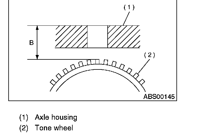2. Measure the distance "B" between surface where the front axle housing meets the ABS sensor, and the tone wheel.