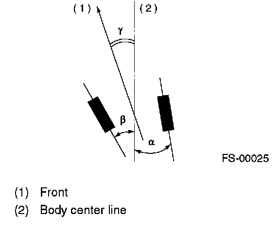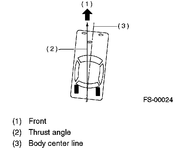 NOTE: Thrust angle refers to a mean value of left and right rear wheel toe angles in relation to vehicle body center line. Vehicle is driven straight in the thrust angle direction while swinging in the oblique direction depending on the degree of the mean thrust angle.