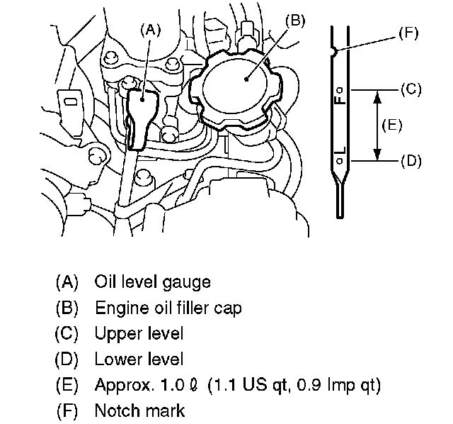 CAUTION: When replenishing oil, it does not matter if the oil to be added is a different brand from that in the engine; however, use oil having the ILSAC or API classification and SAE viscosity No. designated by SUBARU.