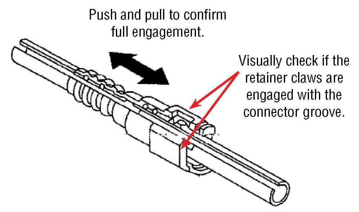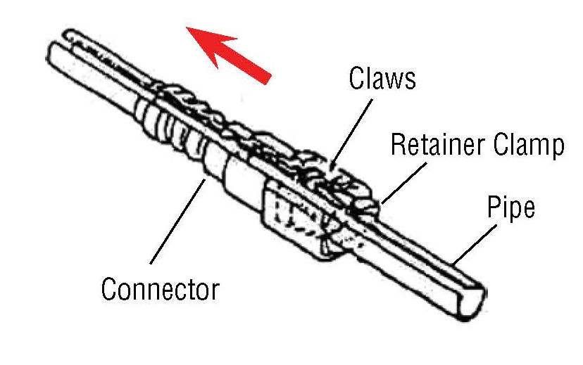 ^ Push and pull the connector lightly several times to ensure the pipe is fully engaged with the connector. Also, visually check if the retainer claws are engaged with the connector groove at both of the two points.