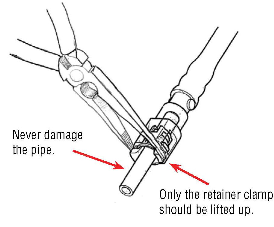 (B) Follow the procedure below if the retainer clamp can not be lifted up using your fingers. Pick up the retainer clamp with a thin tip tool like a pair of needle nose pliers. Since the pipe must not be damaged, take care to pick up on the retainer clamp only.