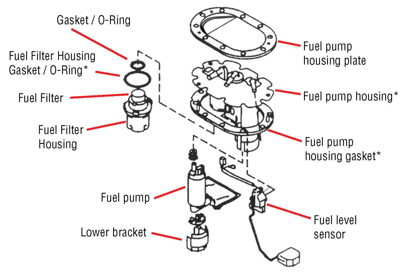 This service procedure will involve replacement of the fuel pump housing and includes transferring the fuel pump, fuel level sensor, and fuel filter from the original housing to the new housing.