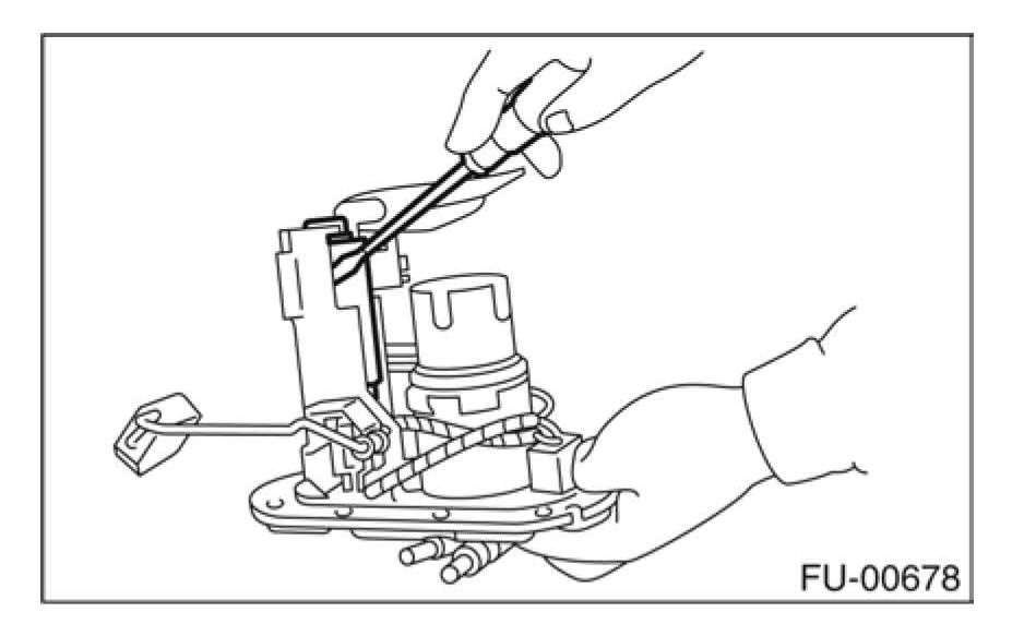 2) While pushing the pawls found on the back side of the fuel level sensor with a screw driver, remove the sensor by pulling it downwards. Caution: Do not attempt to pry on the clips found at the top and bottom of the sensor as this will cause permanent damage to the sensor.