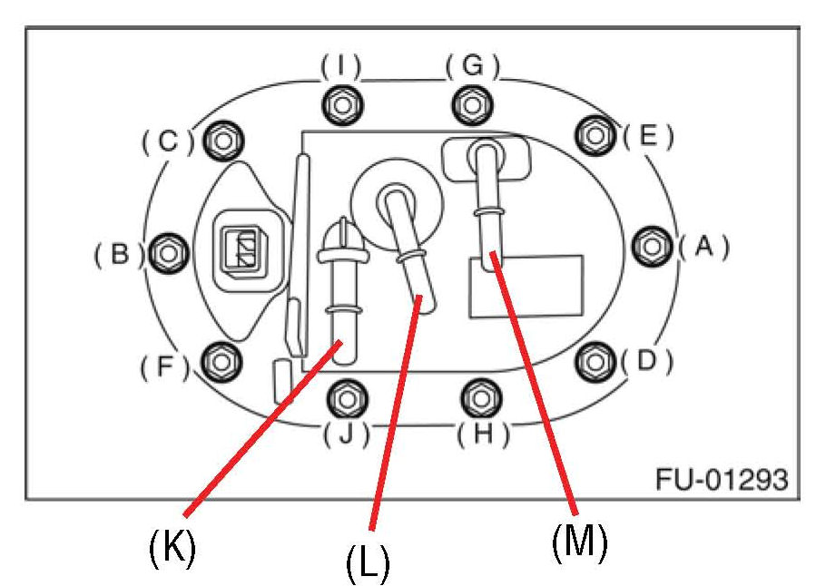 3) Reattach the fuel lines using a new retainer clamp on the fuel delivery line (K); part number 42037AE110. Reuse the retainer clamps previously removed on lines (L) and (M). NOTE: If any retainer clamps were damaged during removal replace with new ones.