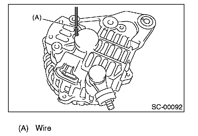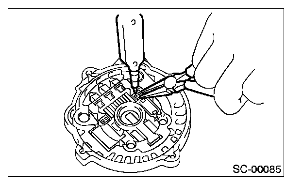 Before assembling, press the brush down into brush holder, and then fix them in that position by passing a [1 mm (0.08 in) dia. length 4 to 5 cm (1.6 to 2.0 in)] wire through the hole shown in the figure.