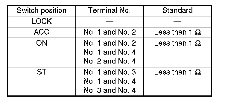 4. Turn the ignition key plate to each position and check the continuity between the terminals of the ignition connector.