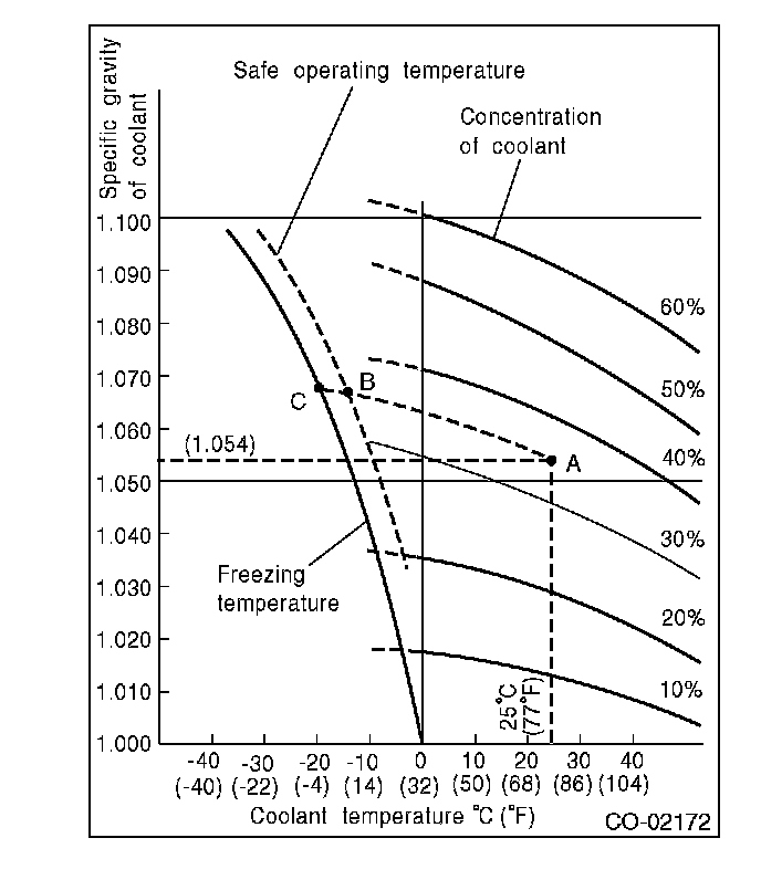 If the coolant temperature is 25°C (77°F) and its specific gravity is 1.054, the concentration is 35% (point A), the safe operating temperature is -14°C (7°F) (point B), and the freezing temperature is -20°C (4°F) (point C).
