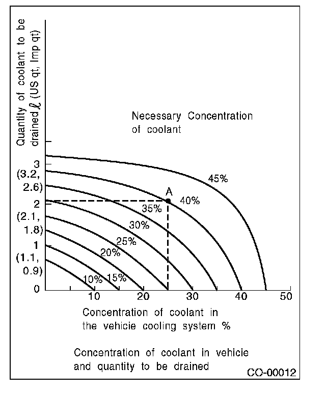 Assume that the engine coolant concentration must be increased from 25% to 40%. Find point A, where the 25% line of engine coolant concentration intersects with the 40% curve of the necessary engine coolant concentration, and read the scale on the vertical axis of the graph at height A. The quantity of coolant to be drained is 2.1 ohms (2.2 US qt, 1.8 Imp qt). Drain 2.1 ohms (2.2 US qt, 1.8 Imp qt) of coolant from the cooling system and add 2.1 ohms (2.2 US qt, 1.8 Imp qt) of the undiluted solution of SUBARU coolant.